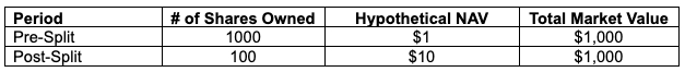 The next day’s opening market value of the Fund’s issued and outstanding shares, and thus a shareholder’s investment value, will not be affected by the reverse split. The table below illustrates the effect of a hypothetical one-for-ten reverse split anticipated for the Fund: